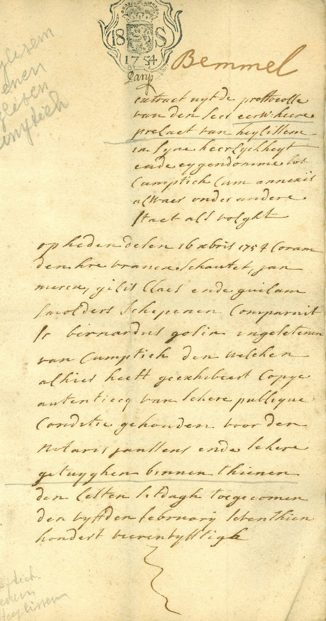 Contract prelaat van Heylissem 1754